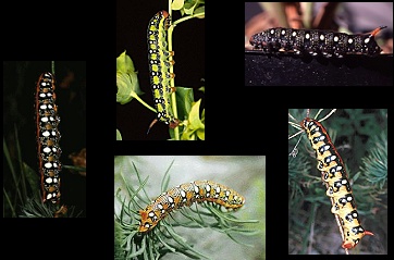 De rups is geel en rood met zwarte velden