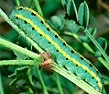 De groene rups heeft 3 helder gele lengtestrepen en 5 rijen zwarte punten.
