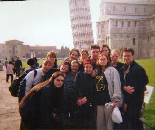 group leaning opposite the tower.