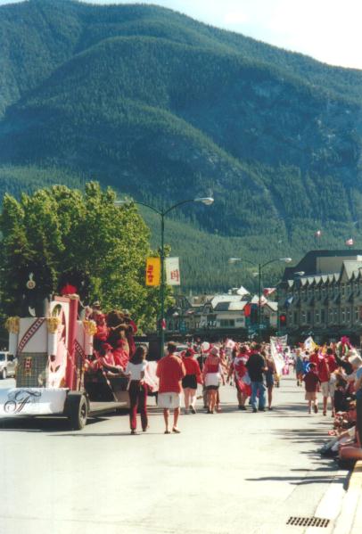 The next week-end we went to Banff, where as in many places visited, I imitated The Karate Kid and executed another flawless Swan Kick. This helped "kicked off" Canada Day in Banff for the first time with a stellar group of Wayne, Simone, Jen, Ainsley, and Jenn (not pictured). As the parade moved through town on Banff Avenue we saw floats, marching bands, antique vehicles and lots of Canada Flags. After the bands were through we went to the Rose and Crown and sat on their rooftop patio which has an excellent view of the mountains. Here is me in my pimp daddy glasses.