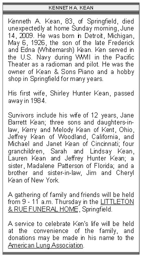 Kenneth Abner Kean was born on the 6th of May 1926 in Detroit, Michigan USA. He died in Springfield, Ohio USA on the 14th of June 2009. He was the son of Frederick Job Kean and Edna Mae Whitemarsh. His first marriage was to Shirley Jean Hunter. She was born on the 24th of August 1924 in (insert location). She died in December 1984 in Springfield, Ohio, USA. She was the daughter of Charles William Hunter and Lola Ethel Hall. His second marriage was to Jane Barrett on the (insert date) 1997 in Springfield, Ohio USA. She was born on the (insert date) in (insert location). She was the daughter of (insert names). | ![]() Shirley Jean Hunter Jane Barrett |