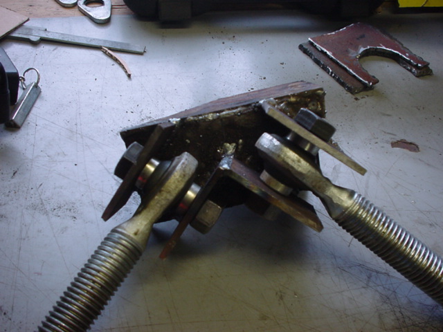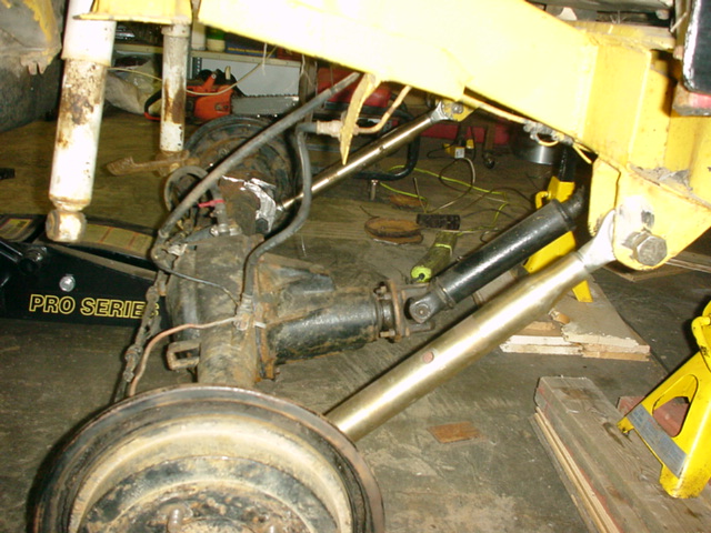 Disassemble the rear suspension, then start cutting out all the bracket's. It makes it easier if they are all the same demnsions. when cutting out the large notch to fit around the axle use a spary paint can, it's the same diameter. cut out four of these plates about 4x4 inches with the notch more offset to one side. Later you can round the edges. drill the holes in the same spot on each one. Next drill out the spring hanger on your frame and test fit with you links. I had to cut some of the tube the eye sockets thread into in order to fit them in. Line everything up even steven and weld.