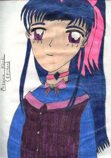 This is Ekishou. She can control the Element of Water and the powers of ice, and she's the first to return to her true self. As a human she's bad at science courses but is a good cook. She is known as Mizuiro Kashi.