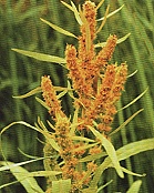 Verspreid hierlangs staan de lancetvormige bladeren.