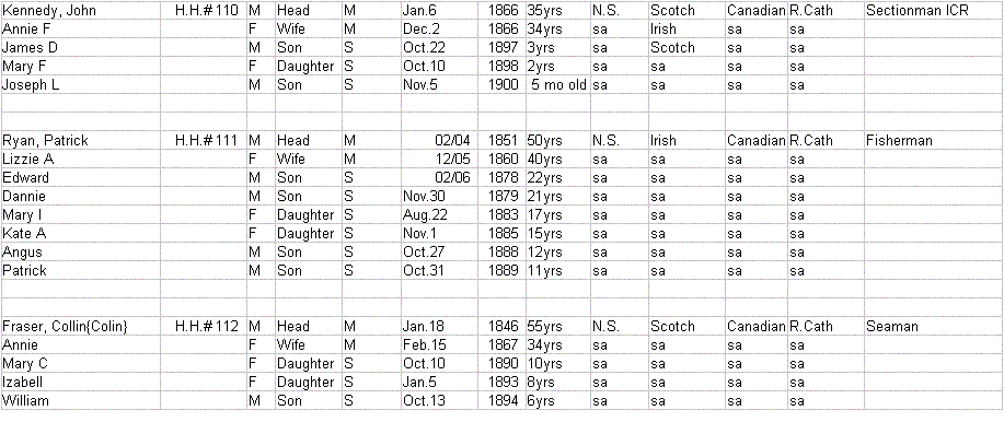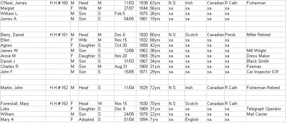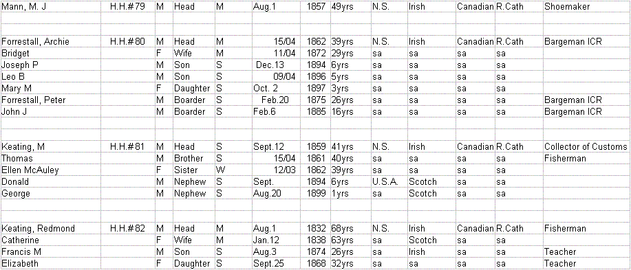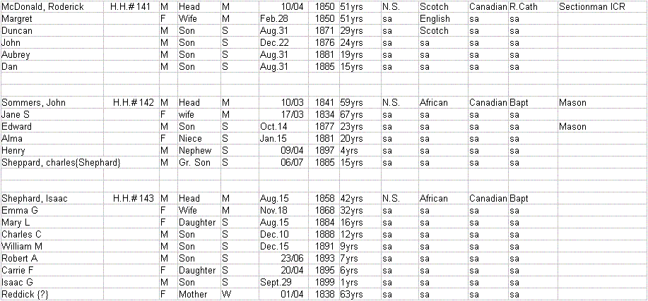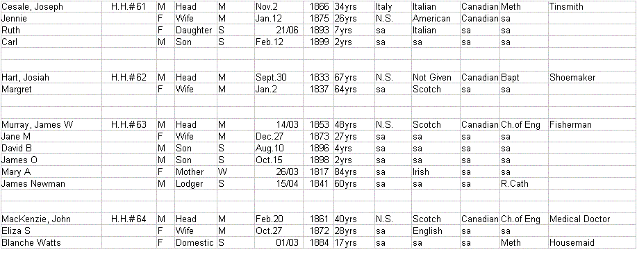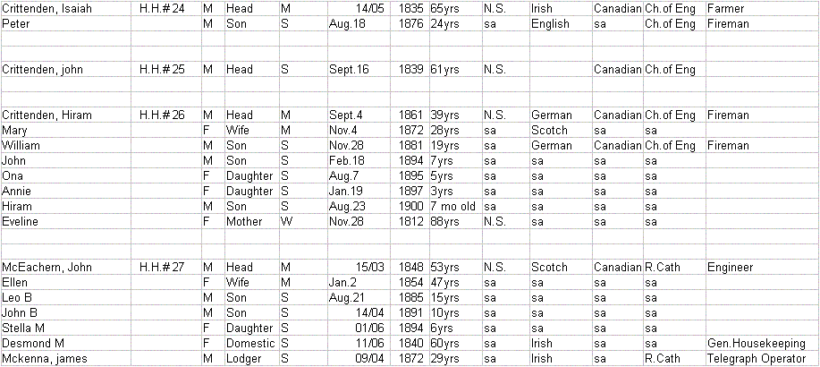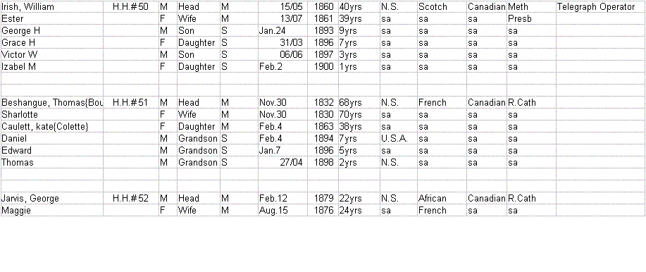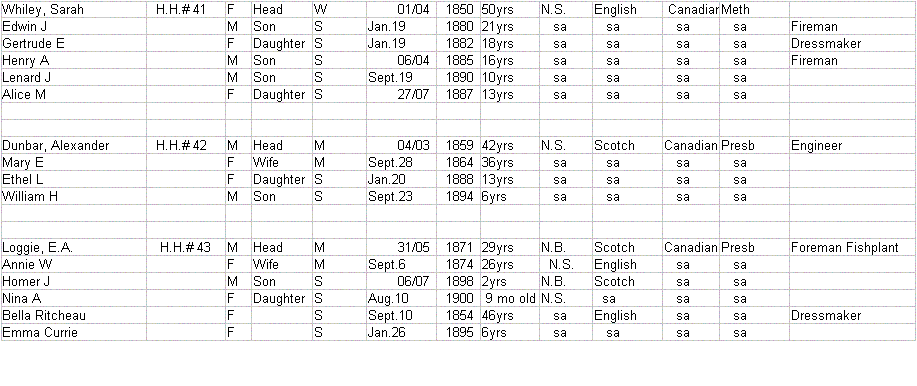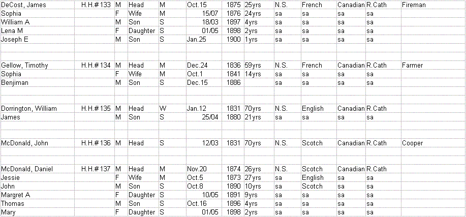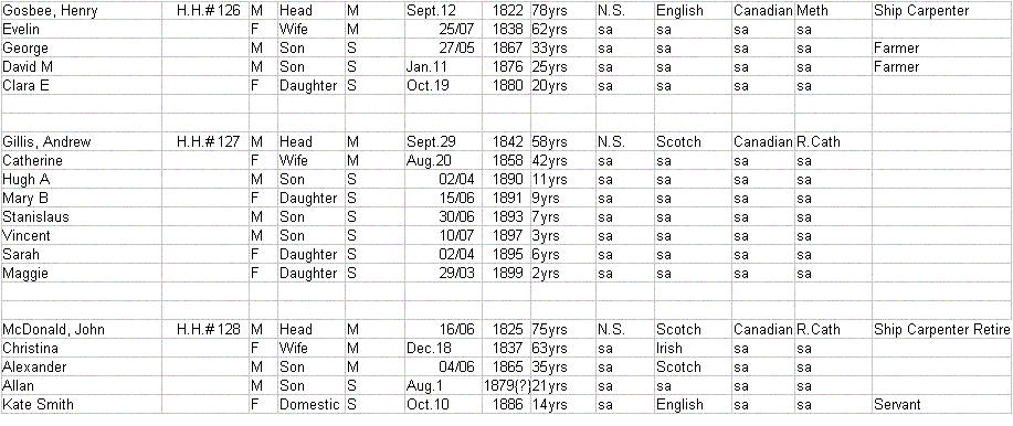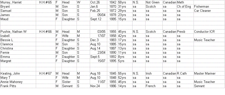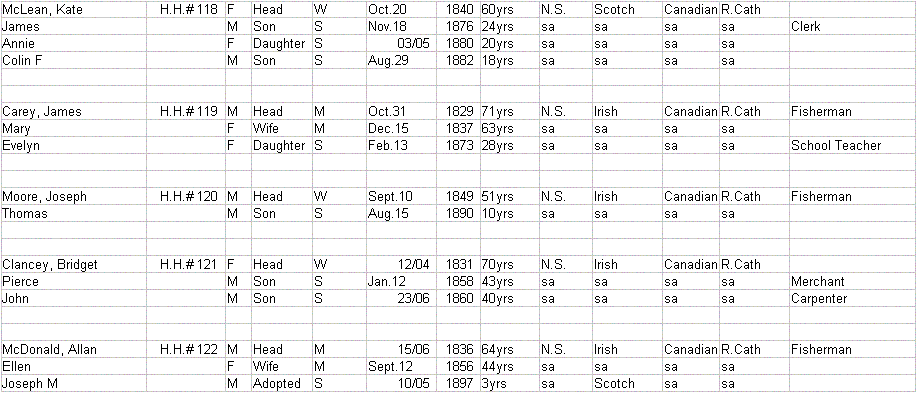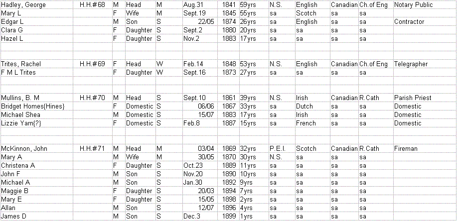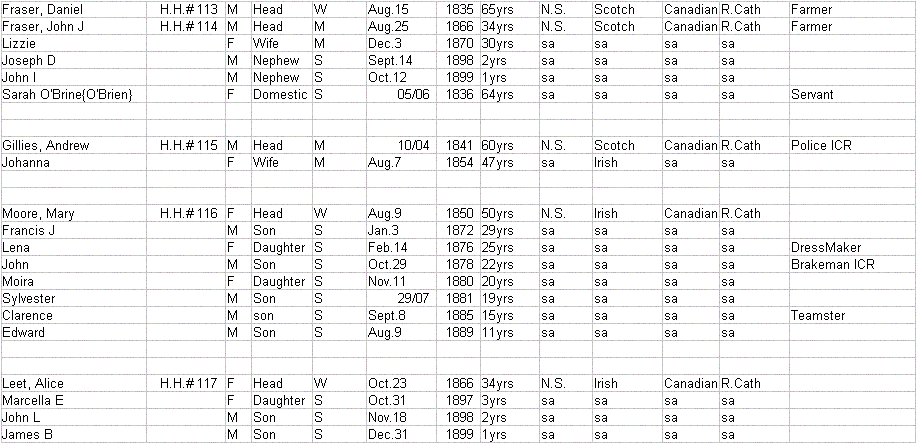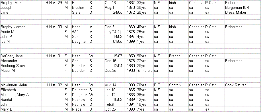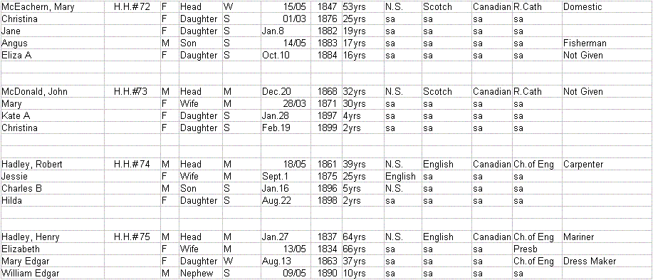 H.H.#42 Dunbar,Alexander H.H.#43 Loggie,E.A. H.H.#44 McLeod,Thomas H.H.#45 Robertson,James A H.H.#46 McLean,Murdoch H.H.#47 Whooten,C.A. H.H.#48 McLean,Andrew H.H.#49 Jefferson,Selby H.H.#50 Irish,William H.H.#51 Beshangue,Thomas H.H.#52 Jarvis,George H.H.#53 Grant,L.A. H.H.#54 McDonald,John K H.H.#55 Whooten,Charles H.H.#56 Webb,Maurice H.H.#57 Stewart,Daniel H.H.#58 Murray,David H.H.#59 Wylde,W.S. H.H.#60 Nicolle,Walter H.H.#61 Cesale,Joseph H.H.#62 Hart,Josiah H.H.#63 Murray,James W H.H.#64 McKenzie,John H.H.#65 Murray,Harriet H.H.#66 Pushie,Nathan W H.H.#67 Keating,John H.H.#68 Hadley,George H.H.#69 Trites,Rachel H.H.#70 Mullins,B.M. H.H.#71 McKinnon,John H.H.#72 McEachern,Mary H.H.#73 McDonald,John H.H.#74 Hadley,Robert H.H.#75 Hadley,Henry H.H.#76 Smith,Mary H.H.#77 Duff,Albert H.H.#78 Sherman,Anastasia H.H.#79 Mann,M.J. H.H.#80 Forrestall,Archie H.H.#81 keating,M H.H.#82 Keating,Redmond