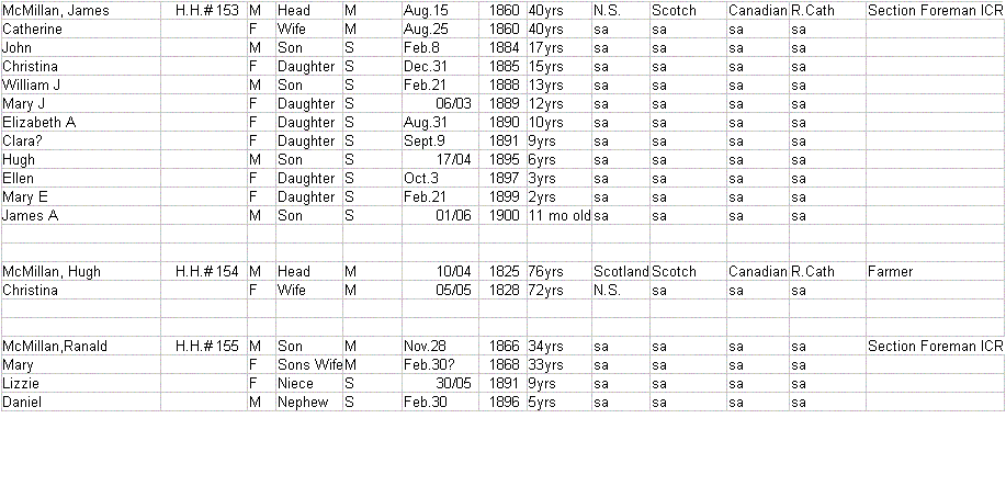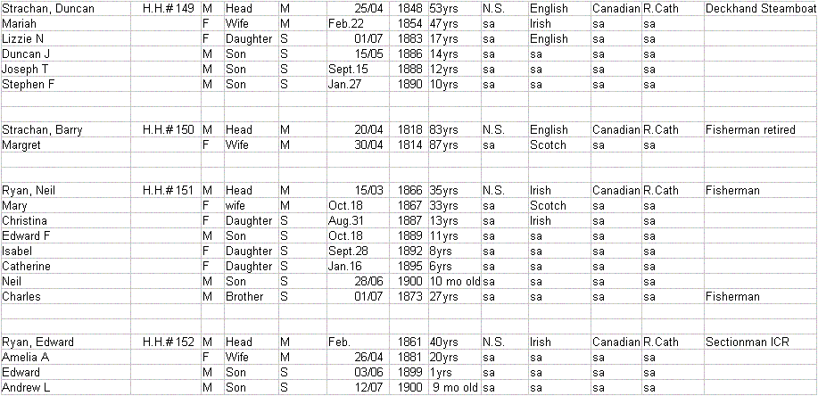 H.H.#124 McLeod,Roderick H.H.#125 Purcell,John H.H.#126 Gosbee,Henry H.H.#127 Gillis,Andrew H.H.#128 McDonald,John H.H.#129 Brophy,Mark H.H.#130 Brophy,James H.H.#131 DeCost,Jane H.H.#132 McKinnon,John H.H.#133 DeCost,James H.H.#134 Gellow,Timothy H.H.#135 Dorrington,William H.H.#136 McDonald,John H.H.#137 McDonald,Daniel H.H.#138 Young,William H.H.#139 Keating,Redmond H.H.#140 McDonald,Roderick H.H.#141 Sommers,John H.H.#142 Shephard,Isaac H.H.#143 Levangie,Michael H.H.#144 Beshong,Robert H.H.#145 Levangie,Michael H.H.#146 McDonald,John H.H.#147 Morrison,Emma H.H.#148 Strachan,Duncan H.H.#149 Strachan,Barry H.H.#150 Ryan,Neil H.H.#151 Ryan,Edward H.H.#152 McMillan,James H.H.#153 McMillan,Hugh H.H.#154 McMillan,Ranald H.H.#155 O'neal,Joseph H.H.#156 O'Neal,Catherine H.H.#157 O'Neal,William H H.H.#158 O'Neal,Henry H.H.#159 O'Neal,James H.H.#160 Barry,Daniel H.H.#161 Martin,John H.H.#162 Forrestall,Mary H.H.#163 Forrestall,Patrick H.H.#164 Forrestall,Edward