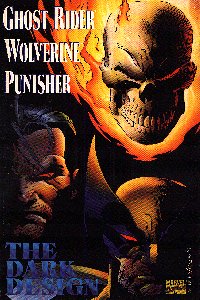 Title : Ghost Rider/Wolverine/Punisher: The Dark Design ISBN #: Not listed GST # : R127032852 First Printing: December 1994 Creative Team: Editor: Bobbie Chase Writer: Howard Mackie Penciler: Ron Garney Inker: Al Milgrom Marvel Timeframe: Wolverine in the blue/gold costume days several years after end of Hearts of Darkness - Ghost Rider currently attached to Dan Ketch Other Marvel Characters of Note: Blackheart, Ghost Rider, Punisher, Mephisto |