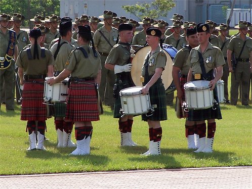 The Pipes and Drums of 3 RAR travelled to Darwin and braved the tropical build up heat to support the two and a half hour parade. Here the Governor General inspects the Pipes and Drums under the watchful eye of the commander 1 bde.