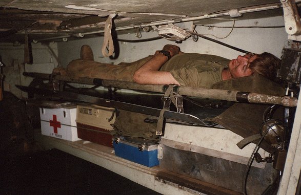 This picture shows the left hand strecher, the tool box has been placed between the stretchers to show the lack of room for the vehicle's Medic to work in. This kit is not commonly used as crews from most units recognise it's limitations with work space and equipment stowage.