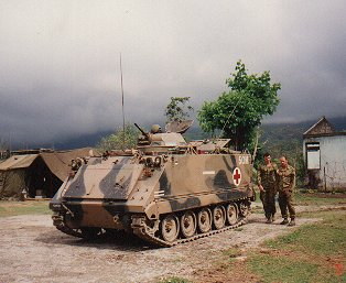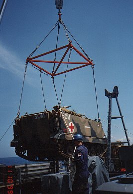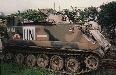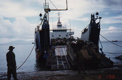 On the 8th Oct 1999, 50M loaded onto the Singaporean transport ship 'Intrepid' to begin it's journey to East Timor. Usually employed as the unit's Medical Officer's vehicle, 50M had been tasked as the Ambulance for Patrols Company. This Company was created to provide the Battalion with a 4th Rifle company and was based on a rerolled Support Company using the Unit's Mortar and Recon platoons in a conventional Mech. Platoon role.
