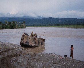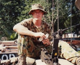We occupied an old school, which the locals had removed the roofing and anything else of use, with the majority of the Company while a platoon was deployed to the other side of the AO. We fashioned a roof over the existing building frame with the tarps from our vehicles and walls using cam nets to give some privacy from the ever present local children. This worked well untill we found that the tarps had many small holes and the Timor wet season tended to send the rain in side ways. Near the end of our stay the Engineers came and the roof was finally replaced. Early attempts to offer our assistance to the aid agencies that operated in the town where hampered by their inability to see past the fact that we were armed.We helped the locals when we could but were never able to look upon the work of the aid agencies favourably again."