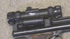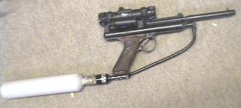 THIS IS A CONVERSION OF A 'CROSMAN 600' WITH AN EXTENDED RESERVOIR AND BARREL NOTE THE LASER SIGHT AS WELL AS THE TELE SIGHT