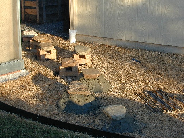 Stepping stone installation - bricks were pinned into ground using rebar, then covered with concrete. |