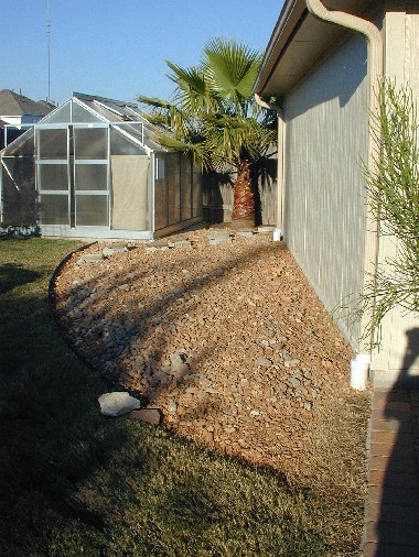 For drainage, broken bricks were distributed on ground, covered with a layer of bull rock, then topped with a layer of brown landscaping rock. The drainage system is about 1 foot deep. |