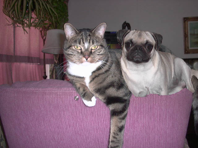 Hi I'm Missy sitting beside my sister Bootsy the cat, I'm the Boss of the house.