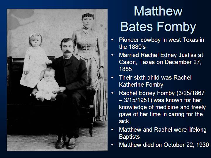Rachel Cathrine Fomby was born to Matthew Bates and Rachel Edney Fomby on April 7, 1894 in Morris County, Texas. Her mother was known for her knowledge of medicine and freely gave of her time caring for the sick. Matthew Bates Fomby had been a pioneer cowboy in west Texas. After three years of cowboy life, had he moved to east Texas and married his wife. Rachel was the fifth of their eleven children.