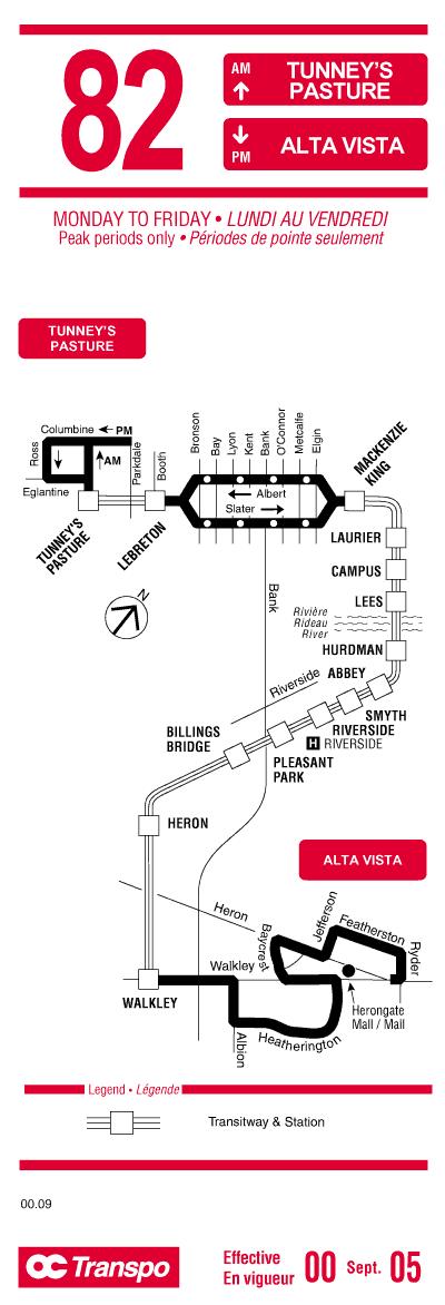 Travel eastbound Walkley Left Ryder Left Featherston Left Jefferson Right Heron Left Baycrest Left Walkley Right Heatherington Right Albion Left Walkley Left ramp to Transitway at Walkley Station Right South Transitway via Billings Bridge Station Left Transitway at Hurdman Station Continue Transitway to Downtown Cross Waller, continue MacKenzie King Bridge Cross Elgin, continue Albert Street Right West Transitway via Lebreton Station Right Tunney's Pasture ramp to Holland Avenue Left Holland Left Columbine Left Ross Left Eglantine Finish at Holland and Eglantine |