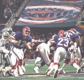 The Top Guns for the Buffalo Bills were duds. Kelly was stymied in his attempt to get the famous no-huddle offense in gear. He set a Super Bowl record by attempting 58 passes, competing only 28 for 275 yards and a couple touchdowns. Thurman Thomas was even worse. He may have found his helmet, but he never found his legs. He had a measly 13 yards on ten carries.