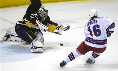 Ryan Miller comes out to make a sprawling save with Rangers left winger Sean Avery on the doorstep during the third period action. Miller was the top star in Sabres 3-2 win.