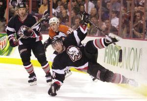The game plan of the Flyers was obvious. It was the same one they followed to a tee last season when they beat the Sabres in five games. Out-muscle the Sabres and knock Hasek around. The most ferocious hit that Hasek took was a result of Vaclav Varada knocking Peter White right into the Sabres netminder in the first period, right after the penalty shot. Hasek stayed down for a few minutes and it looked as if Martin Biron may have to go in for Hasek, but after a while and to the dismay of the booing Flyers fans, Hasek got up and was stellar the rest of the way.