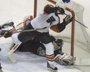 Simone Gagne charges through the crease and scores on Sabres goalie Dominik Hasek in the first period of the Flyers 3-1 victory.