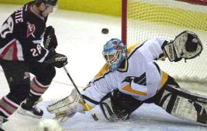 Down and out! Penguins goalie Johan Hedberg lies face down after being beaten by Sabres winger Miroslav Satan in the third period.