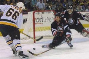 Mario Lemieux aims for the open side of the net but Sabres defenseman Rhett Warrener saves the day by blocking the shot.