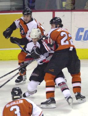 The Flyers put the squeeze on Sabres right winger Vaclav Varada. Flyers defenseman Luke Richardson (22) along with Flyers center Daymond Langkow, but a vice squeeze on Varada in the first period, preventing him from penetrating the Flyers zone.