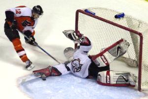 Hasek makes a sprawling save on Flyers center Simon Gagne in the second stanza. Hasek only had to make 15 saves, compared to his Czech countryman Roman Cechmanek, who made 36 saves. Hasek has yet to beat Cechmanek in 4 tries.
