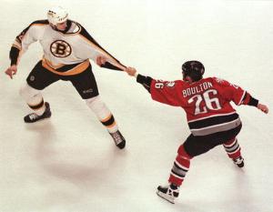 It takes two to tangle. Sabres' Eric Boulton and the Bruins' Andrei Nazarov hold each other's shirt before they start landing punches in the final period..