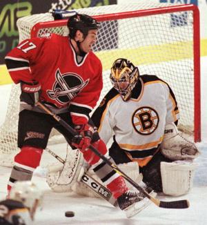 Former Sabre Dixon Ward finds out how hard it is to score against his old teammate as Dominik Hasek stops Ward's shot and covers up. Hasek recorded his third shutout of the season against the Bruins..