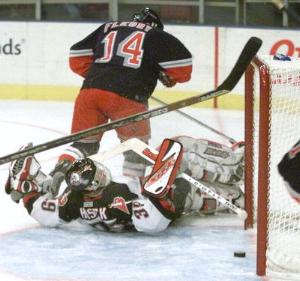 Theoren Fleury scores the first of his two goals against Dominik Hasek in the second period. Hasek watches the puck as it's about to slide over the goal line. This goal marked the start of a 4-goal outburst against the Dominator.