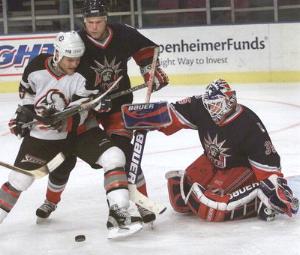 Vaclav Varada attempts to cut in on Rangers goalie Mike Richter, but his shot is blocked as New York defenseman Dale Purinton attempts to thwart Varada's stride.