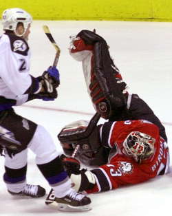 Kristian Kudroc took a long shot on Biron that hit his catching mit and made the back of the net. It was a goal very similar to the one that Dominik Hasek had allowed the night before against Florida when he waived at a shot from the blue line by Pavel Bure.