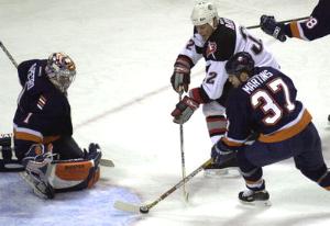 Rob Ray and Islanders goalie Rick DiPietro have their first confrontation of the night. Here Ray tries to put one past DiPietro, but the goalie blocks it. Later in the game, DiPietro skated down the ice to confront Dominik Hasek in a wild brawl, but Ray cross-checked DiPietro before he could get to the Sabres goalie.