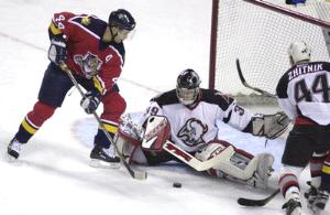 Dominik Hasek against the Florida Panthers last December, performs the splits as he makes a save on Rob Niedermayer while defenseman Alexei Zhitnik attempts to clear the puck. Now he will be doing his slinky act in Detroit.
