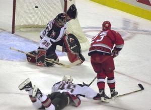 The Sabres actually tied the game some 87 seconds later when Denis Hamel lifted a shot over Irbe from the left circle. Could it be the Sabres were going to stage a miraculous comeback? Not if Francis had anything to do with it. He was able to retrieve the puck after a Sami Kapanen shot got past Biron in the crease. Francis had no problems putting it into the empty net.