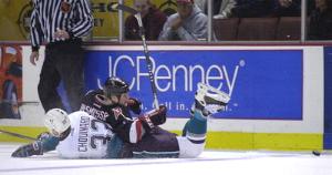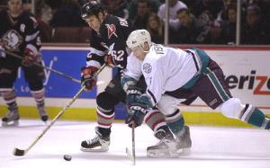 Curtis Brown tries to slow down Anaheim's Marty McInnis in the first period..