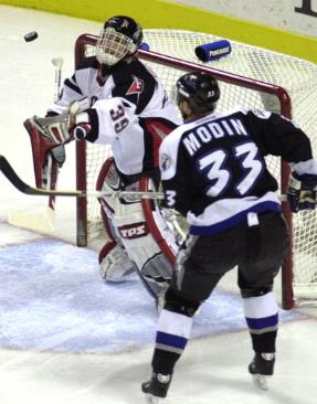 Dominik Hasek gets ready to catch the puck as Lightning left wing Fredrik Modin zeros in to get a possible rebound. Hasek made 40 saves in the game and stole one for the Sabres.