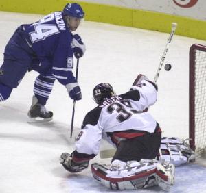 The Leafs scored their final goal of the game on a shot that Hasek would like back. Thomas Kaberle took a shot and it came out to Sergei Berezin standing in the bottom of the left faceoff circle. Berezin's blast got through an opening that Hasek left under his arm and hit the back of the net. In Hasek's former Vezina Trophy years, he would have had that area blocked.