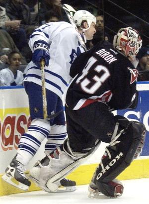 On the play that led up the the Leafs first goal, Sabres goalie Martin Biron gets his stick up high on Leafs' Shayne Corson during second period action. Corson proceeded to impede Biron's attempt to get back into the net by clearly holding the goalie's stick. Tie Domi then shot the puck into the empty net for the winning goal.