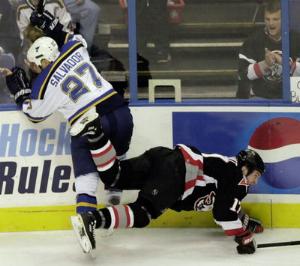 Sabres' J. P. Dumont falls to the ice as he puts a hit on the Blues' Bryce Salvador in first period action.