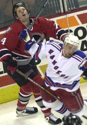 Sabres defenseman Jay McKee reacts to having a stick hit him in the chin by the Rangers' Jan Hlavac during the second period of the Sabres 6-3 win over the Rangers.