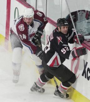 Doug Gilmour, who scored his 5th goal of the season against the Avalanche, lets the ice fly as he turns on the breaks in front of Avalanche defenseman Jon Klemm.