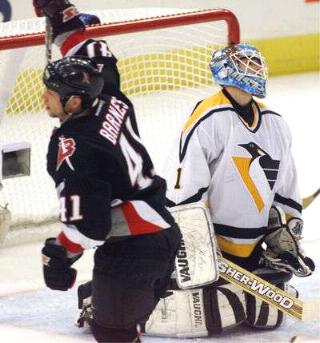 Late in the third period, Alexei Zhitnik went off for holding and the Pens had a glorious opportunity to take the lead. But Curtis Brown picked off Alexei Kovalev's pass and Brown went in on a 2-on-1 with Miroslav Satan. After the two passed back and forth, Brown was able to beat Hedberg to put Buffalo in front 2-1 to end the period.