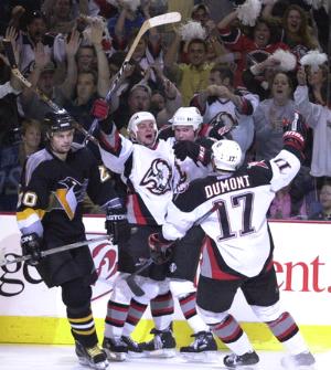 The celebration is on! Stu Barnes is mobbed by his teammates and he raises his stick in glee after scoring the game winning goal in overtime to beat the Penguins 3-2 in Game 5.