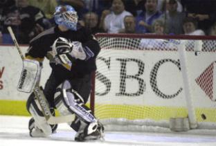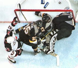 All Penguins' goalie Johan Hedberg can do is to look over his shoulder as Stu Barnes overtime shot beats him for the winning goal. The win puts the Sabres one victory away from advancing to the Eastern Conference Finals.