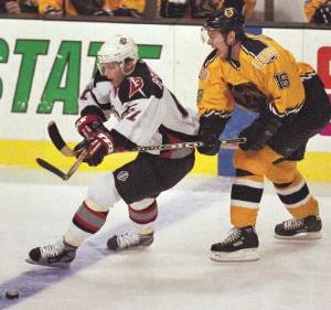 The biggest factor in the Sabres sudden collapse is an utter lack of offensive production. The powerplay is nonexistent. Buffalo had a huge break against the Bruins when Boston's top player, Joe Thornton went ballistic on Alexei Zhitnik's head late in the first period. Zhitnik had taken Thornton into the corner boards and Thornton came up swinging, giving Zhitnik a sucker punch in the back of his head. Zhitnik fell down on all fours and Thornton came up behind him and started wailing away, smashing his fists into the back of Zhitnik's helmet. Zhitnik had his front tooth chipped by Thornton's thuggery. The refs threw the book at Thornton, giving him a two minute minor for instigating, a 5-minute fighting major, a 10-minute misconduct, and a game-misconduct.