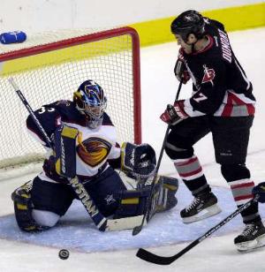 Thrashers goaltender Milan Hnilicka stops Buffalo's J.P. Dumont point blank in first period action.