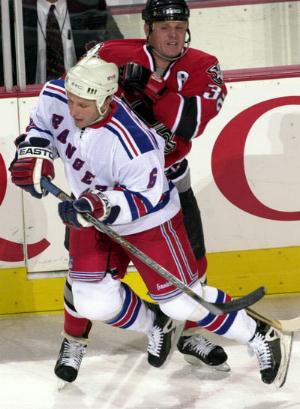 Rob Ray assaults the Rangers' Darius Kasparaitis from behind in first period action. Ray got a 4-minute penalty and the Sabres were 2 men short, allowing Eric Lindros to score twice.